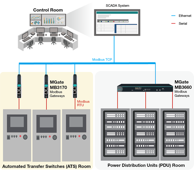 To monitor power usage and quality, the power supply equipment, including switchgears, PDUs, and UPSs, connect to networks so that operators can receive real-time information. Our MGate MB3000 protocol gateways bridge communication between serial-based Modbus RTU devices, such as power meters used inside power supply equipment, and Ethernet-based SCADA systems in the control center. When corporate IT personnel are required to perform a vulnerability scan, they must scan thousands of MGate MB3000 protocol gateways so that they can take immediate action if they identify a vulnerability.